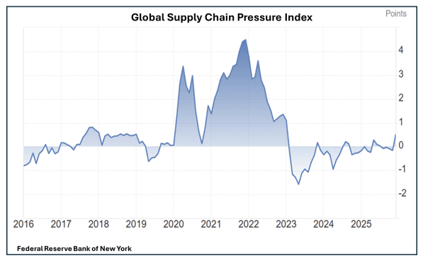 The Federal Reserve Bank of New York’s Global Supply Chain Pressure Index (GSCPI) quantifies disruption using a z-score, measuring stress in standard deviations from its historical mean. In December 2021, the index reached 4.4 standard deviations above average, an extreme reading. This signalled failure, not congestion: transport capacity, ports, and delivery schedules could not scale with rebounding demand, triggering a bullwhip effect (a cascading mismatch where small demand shocks amplify into large upstream disruptions).