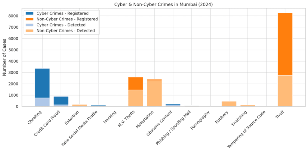 Mumbai, the financial hub of India, is facing a significant challenge in dealing with cybercrime. According to 2024 data, the city’s police force is successfully solving traditional crimes like theft and robbery with a detection rate of over 51%. However, the picture is far grimmer when it comes to cybercrimes. Offences like online cheating, phishing, and financial frauds have a much lower detection rate of just 23.3%, with only 1,115 of the 4,786 registered cybercrime cases solved.