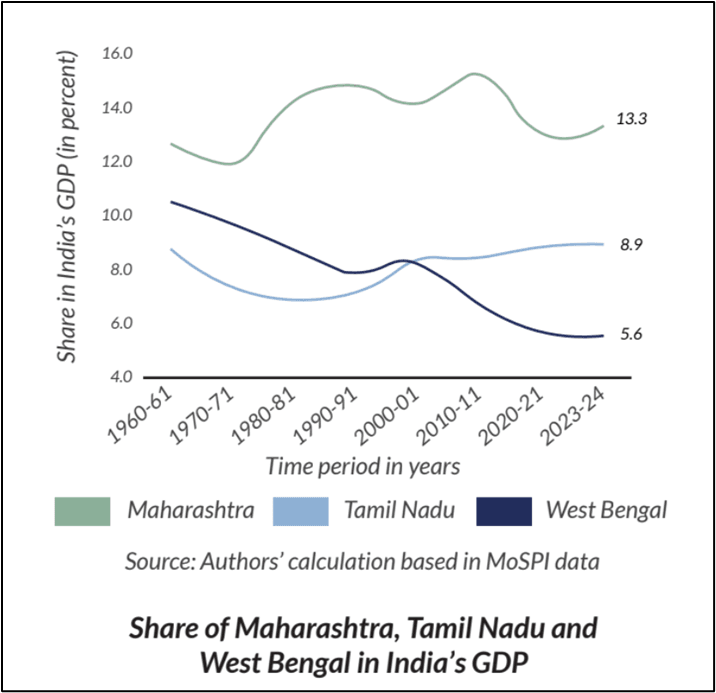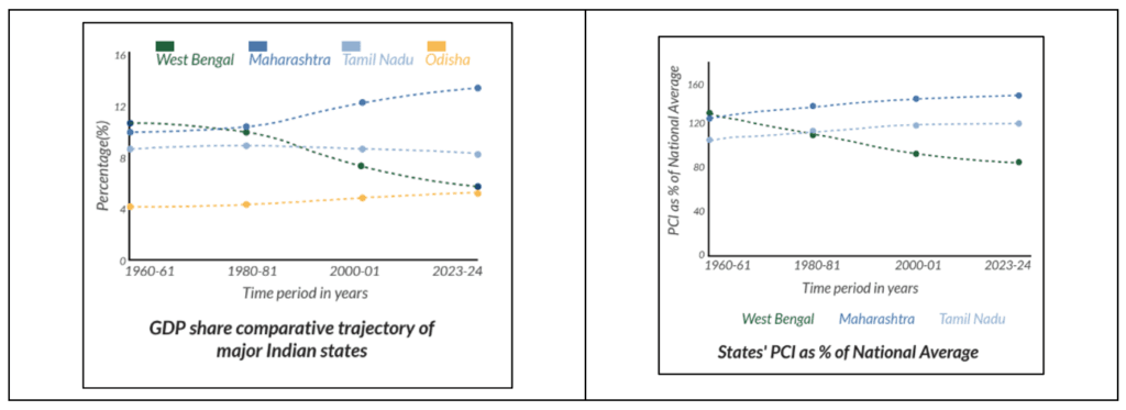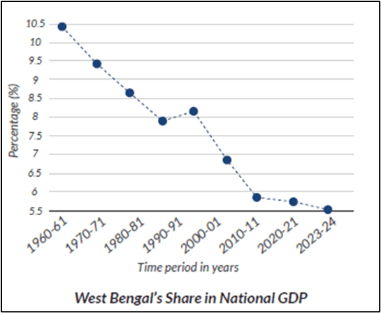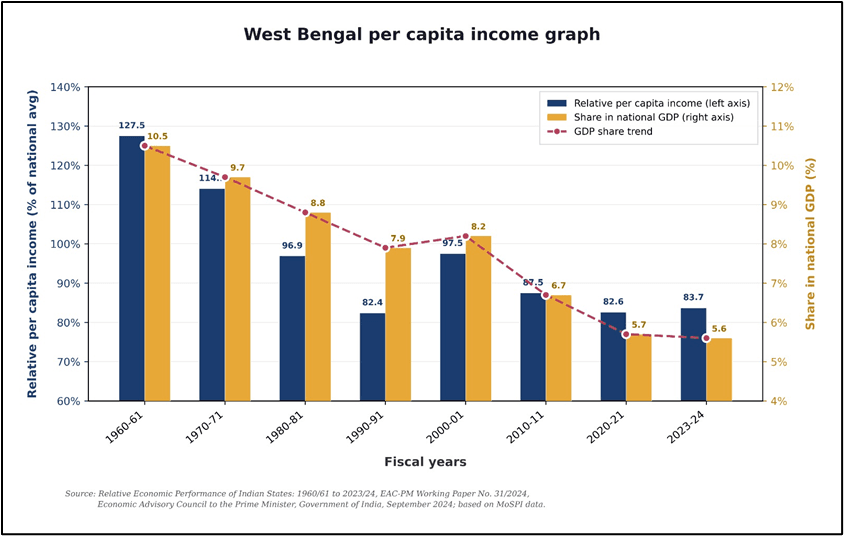West Bengal’s post-Independence economic journey represents one of modern India’s most important cases of regional economic divergence. Once synonymous with industrial might and home to bustling jute mills along the Hooghly, engineering giants supplying national railways and Kolkata as the undisputed commercial capital of the East, the state has witnessed a steady erosion of its relative standing. According to the Economic Advisory Council to the Prime Minister’s (EAC-PM) comprehensive working paper Relative Economic Performance of Indian States: 1960-61 to 2023-24 by Sanjeev Sanyal and Aakanksha Arora, West Bengal’s share of national GDP declined from 10.5% in 1960-61 (third-highest among states) to just 5.6% in 2023-24 which is the sharpest drop recorded for any major state. Its relative per capita income fell from 127.5% of the national average (ranking among the top three) to 83.7% by 2023-24, placing it below states which were once far behind West Bengal, including Odisha. [2][3]