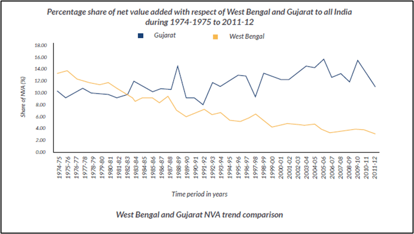 - In 1977–78, the year the Left Front came to power, West Bengal was ranked second only to Maharashtra in industrial employment and value-added among Indian states. By 1987-88, a single decade into CPI(M) rule, it had fallen to fourth in employment and fifth in value-added. By 2007–08, it ranked seventh. Over the same period, Gujarat rose from 9.7% to 16.1% of national industrial production, and Maharashtra maintained 18-19%.[41]