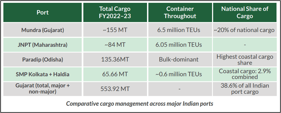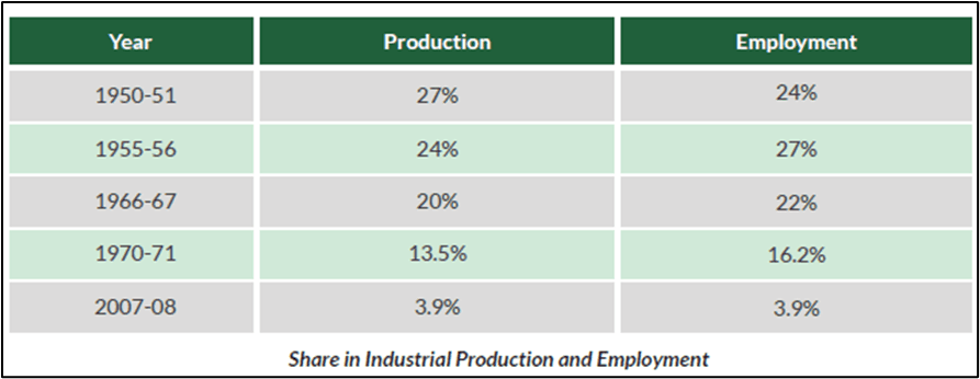 - In 1950-51, coastal provinces dominated national output: undivided Bombay (including future Gujarat) at 33%, West Bengal at 27%, and Madras at 12%. Central Statistical Organization’s Statistical Abstract India 1952-53 and the Census of Manufacturing Industries (1951), records West Bengal with 1,493 registered factories, the highest in the country surpassing the combined total of Maharashtra and Gujarat. Organized sector employment and production shares stood at 27% and 24% respectively by 1955-56.[5]