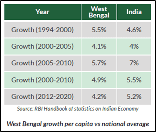 - The period following 2011 represents a decisive phase in West Bengal’s economic trajectory, marked by repeated political commitments to industrial revival, and lip service to accelerated growth. These commitments were articulated prominently during electoral cycles and policy announcements. However, an examination of official data, comparative state performance and realised outcomes reveals a widening divergence between policy promises and economic delivery, contributing to a continuation, and in some indicators, an intensification, of the state’s long-term relative decline.
