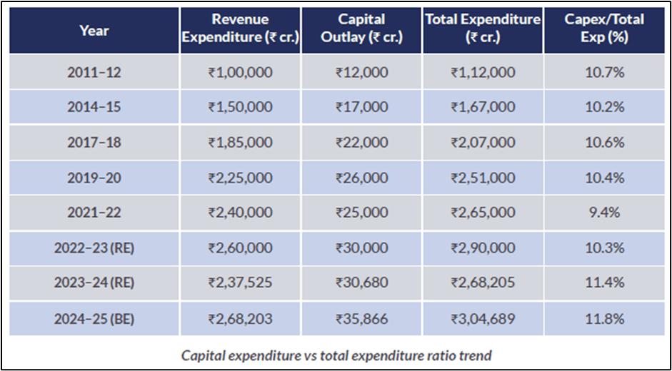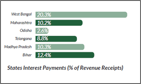 - Perhaps the most concerning feature of the past decade has been the state’s rising debt burden. West Bengal’s outstanding liabilities have grown significantly, with a large portion of revenue receipts consumed by interest payments and salaries. Revenue expenditure has consistently overshadowed capital expenditure.