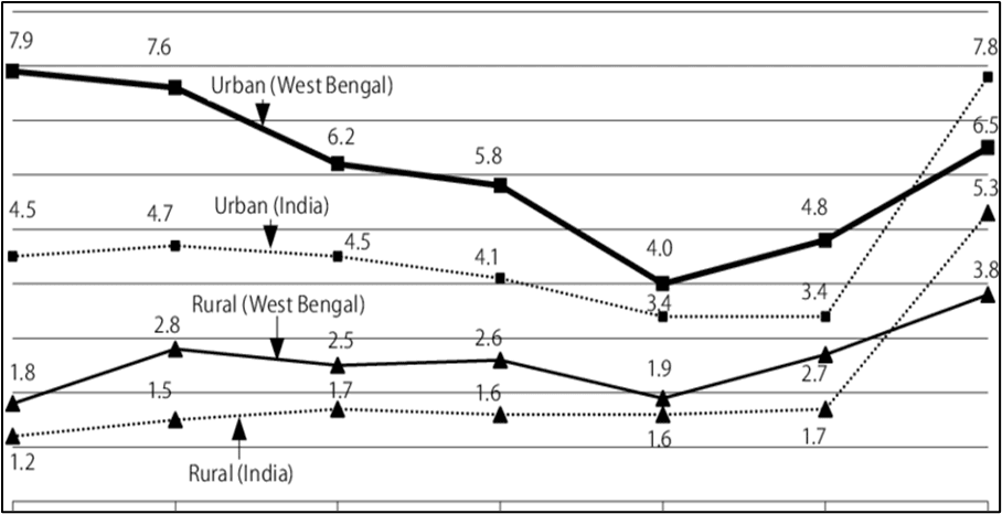 - The progressive casualisation of the workforce was the direct product of this system. The West Bengal Statistical Handbook data shows that the share of informal employment among non-agricultural workers rose from 69% in 1999–2000 to 75% in 2004–05 overall, and from 71% to 78% in rural areas, and in urban areas from 68% to 72%.[32]