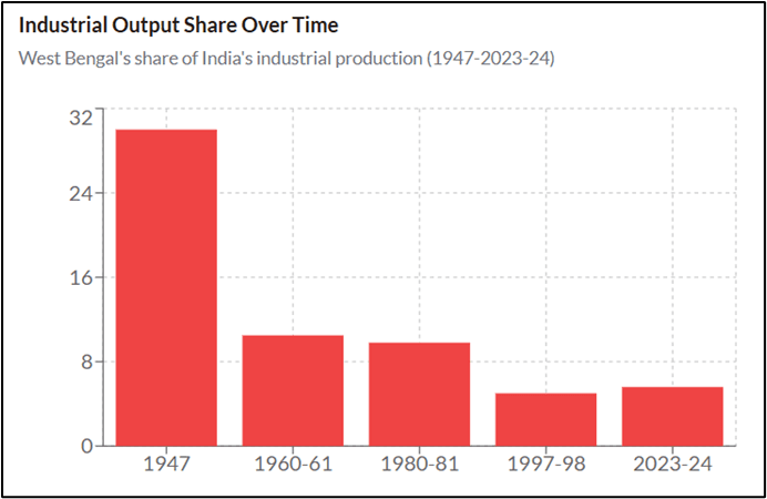 - Ray concludes the core issue was ‘poor work culture, political interference, and failure of governance’ creating anarchy that deterred investors. All parties contributed to the CPM via unions, TMC via bandhs but the scale under the Left rule entrenched the decline. EAC-PM data shows the state’s GDP share dipping to ~6.7% by 2010-11. The era ended with massive anti-incumbency in 2011, but its industrial legacy, closed factories, extinguished chimneys still remains a critical and everlasting issue.[15]