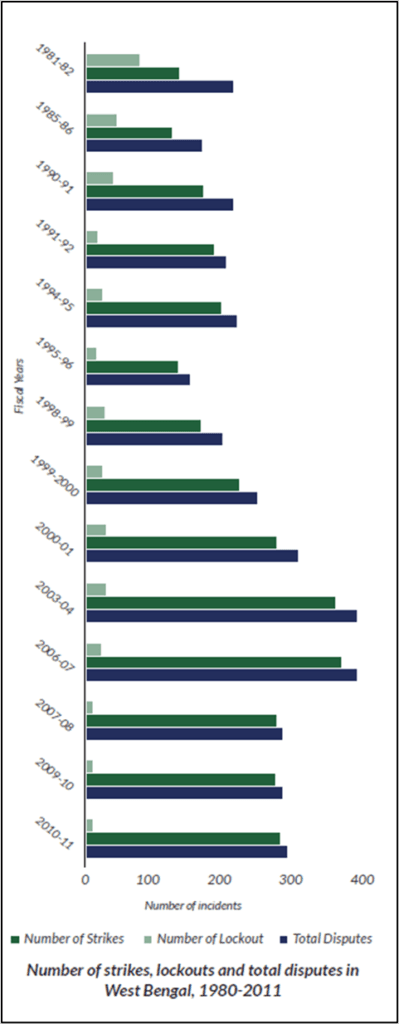 - In 1991, West Bengal recorded 192 lockouts. Man-days lost to lockouts averaged approximately 20 million annually in the early 1990s. For context, West Bengal contained approximately 7% of India’s industrial workers but accounted for over 40% of national lockout-related man-days lost in that period. In 1996, West Bengal ranked second nationally and 4 times ahead of the national average in lockout frequency with 80 official lockouts, while the median for other major states was fewer than 20.[31]