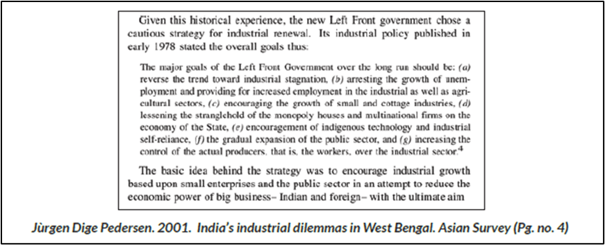 - West Bengal’s share in industrial production fell from 13.5% in 1970-71 to 5.1% in 1997-98 and 3.9% in 2007-08. The jute and engineering industries withered. Capital flight accelerated due to ‘lawlessness and militant trade unionism.’ Congress and the Left both encouraged small holdings via reforms, making land acquisition ‘impossible without acrimony’. These policies had unintended long-term economic consequences, particularly by making industrial land acquisition highly contentious.
