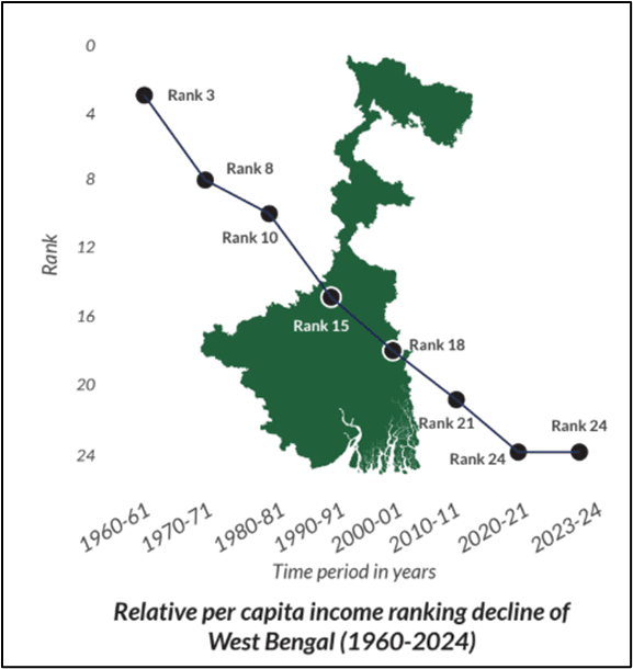 Economically, West Bengal remained vibrant into the early 1960s, but policy headwinds and demographic pressures set the stage for reversal. The “Bengal Curve” captures this poignantly: 1960 rank 3 richest but by 2024, rank 24. [1]